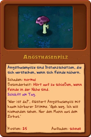Der Angsthasenpilz (Englisch: Scaredy-shroom) ist ein Fernkämpfer, der ähnlich wie die Erbsenkanone ist, nur kostengünstiger. Er wird benötigt, um in den Nachtleveln als frühe Verteidigung eingesetzt werden zu können. Angsthasenpilze sind einzigartig, da sie sich verstecken (und somit nicht mehr angreifen), wenn sich ein Gegner zu nah an sie heranwagt.
