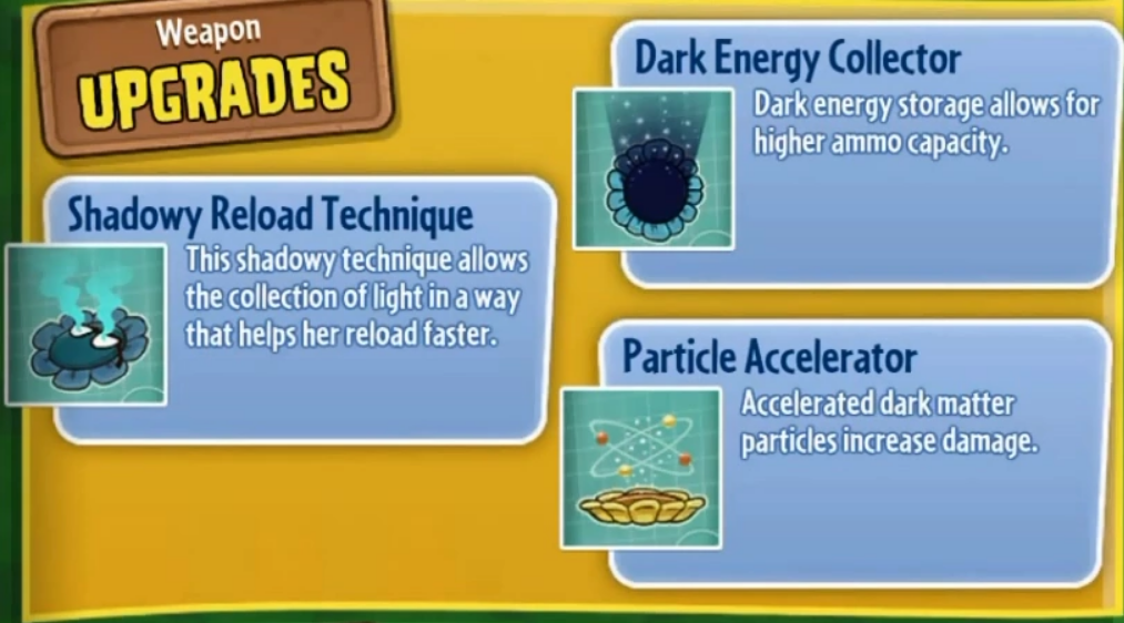 Énergie Noire est l'arme principale de Shadow Flower; tous les faits ci-dessous s'appliquent à une arme entièrement améliorée.