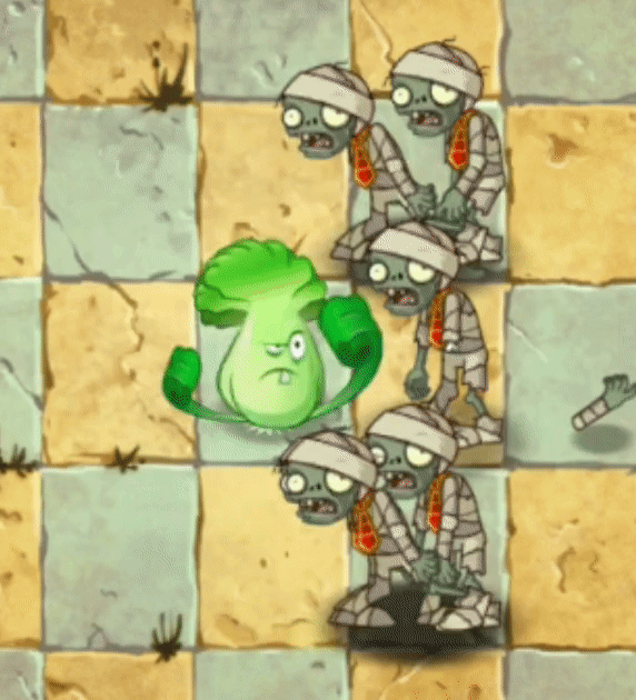 Bonk Choy is a plant in Plants vs. Zombies 2, obtained after beating Ancient Egypt - Day 13. He attacks by punching the closest zombie one tile in front of or behind it. He punches once every 0.33 seconds, dealing 15 damage per punch.