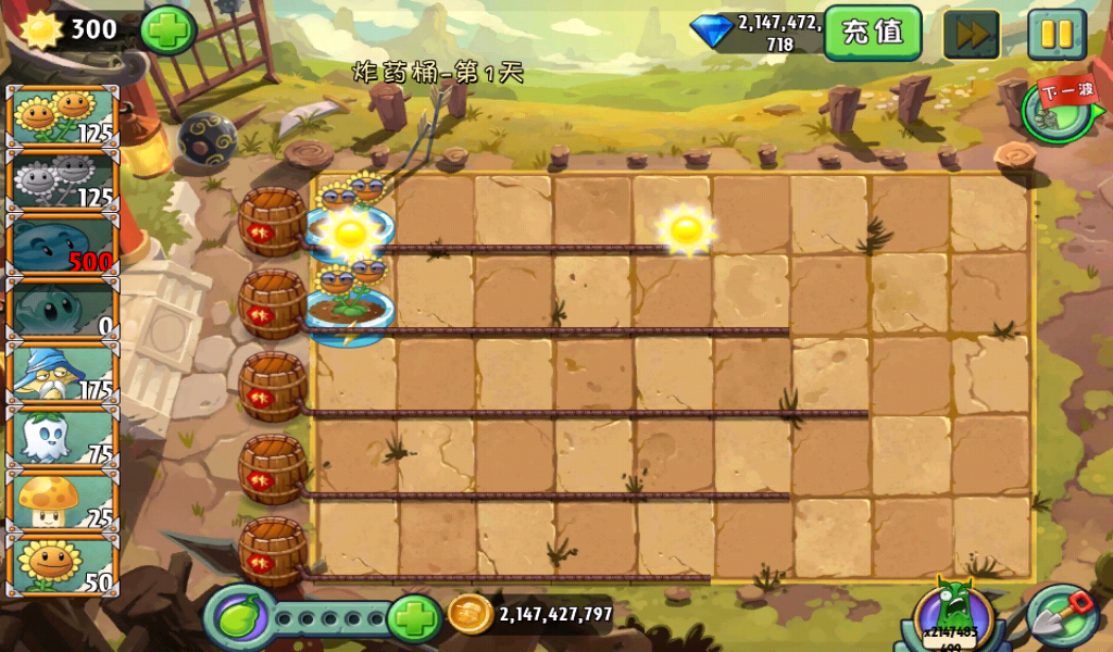 Here the player tries to avoid the flames of the torches from destroying the kegs. If all the kegs explode, the player loses. Ice plants, such as Iceberg Lettuce and Snow Pea, can extinguish the flames.