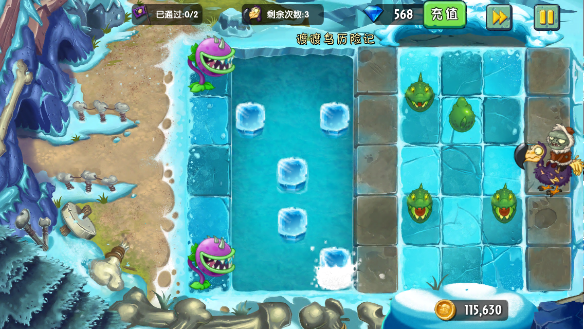 The player controls a Dodo Rider Zombie past danger to get to the end. This is the 2nd Brain Buster in which the player controls the zombie(s) instead of the plant(s). The dodo has 3 lives. If the dodo touches the Chomper, gets bit by the Guacodile or falls in the water, the dodo will lose a life. If all 3 lives are lost, the game is over.