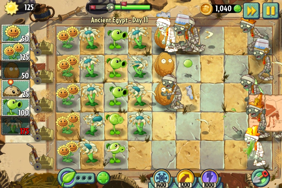In this Brain Buster, the lawn is filled with plants and the player must swap them either horizontally or vertically to make a match of 3 or more plants which will make them disappear and give sun, similarly to how Candy Crush works. Make a match of four or more plants will activate their Plant Food effect. Matching three armored defensive plants gives the player significantly more sun than usual. The player can use the sun to upgrade the plants into other different plants. The player must make the specified number of matches to beat the level. This is similar to the mini-game by the same name, Beghouled.