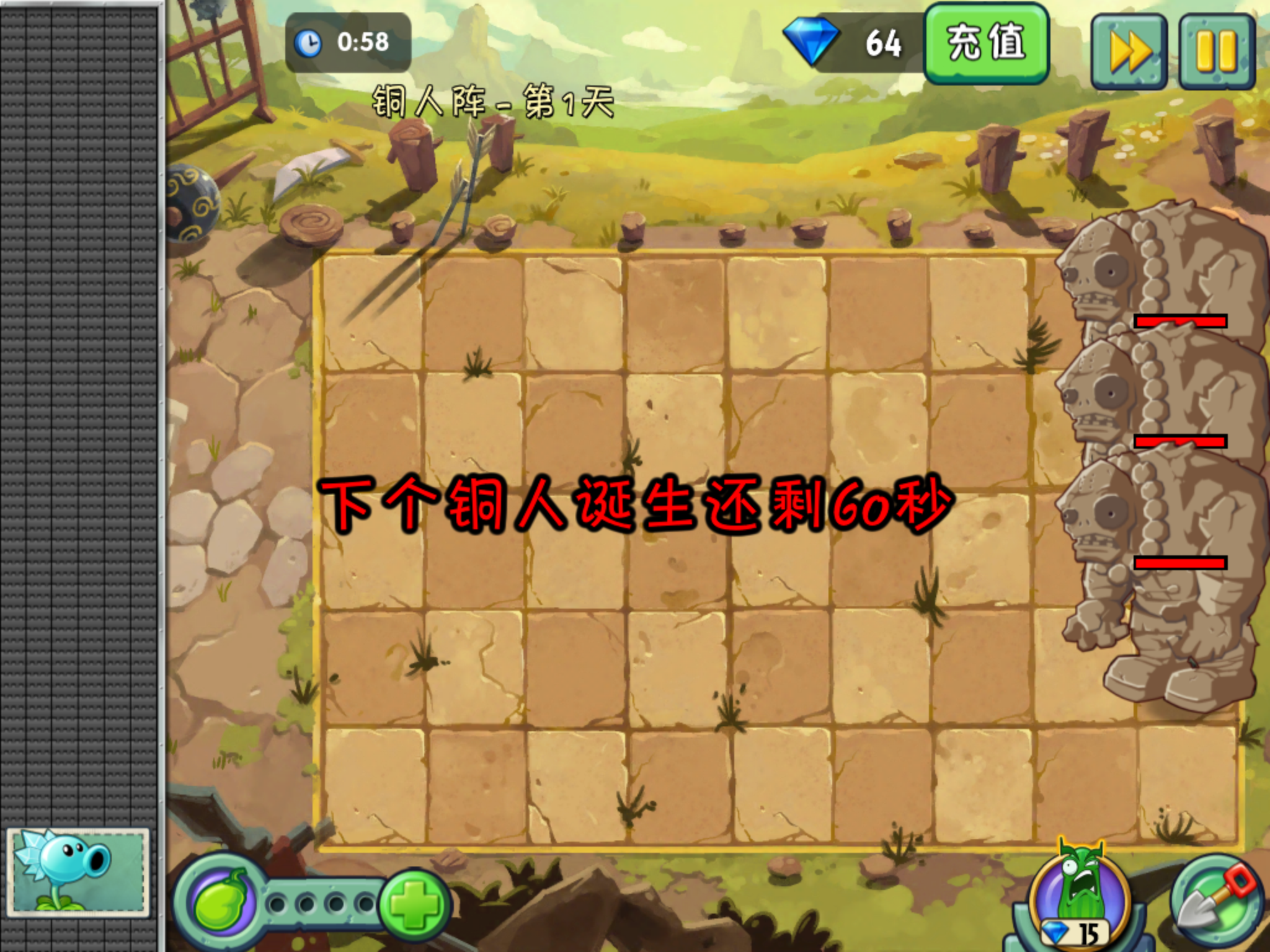 The player must use the plants given to them via conveyor-belt. There are a certain number of petrified Gargantuar Bronzes that will attempt to free themselves from petrification given by the timer. These petrified warriors can be destroyed by plants. If the player fails, the Gargantuar Bronze is free from petrification and is ready to smash the Player's line of defenses. The more petrified Gargantuar Bronzes are there, the harder the battle becomes. The player wins when all zombies are killed.