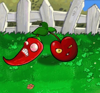 In English: Cherrypeno Cherrypeno can destroy enemies in three rows. Power: 1800 Cherrypeno: "I'm going to explode", "No, I'm going to explode!". The Cherry Bomb brothers had a long-running debate over the word "explosion" - but the emergence of "explosive" Jalapenos settled this debate. Recharge: very slow |
