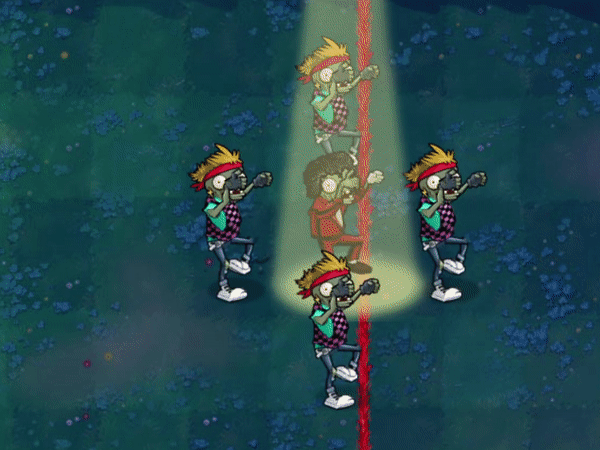 The Dancing Zombie enters the lawn dancing backward. It is accompanied by his own jingle tune and also a color-changing spotlight appears out of the sky, following the Dancing Zombie. He then turns around and summons four Backup Dancers in the squares above, below, in front of, and behind him. Then, he starts dancing across the lawn moving close to the Player's House. The Dancing Zombie and his Backup Dancers dance at the same speed and won't break formation. If one of them has to stop or is slowed down through freezing, the others will stop or slow down as well. If any of his Backup Dancers die, the Dancing Zombie will summon replacements. It is worth 5 points in zombie spawning. The Dancing Zombie only spawns in the middle 3 lanes in Day and Night.