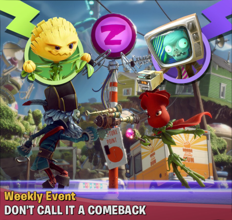 Don't Call it a Comeback is a Weekly Event game mode in Plants vs. Zombies: Battle for Neighborville. It is a variant of Suburbination which allows the player to play as Wildflower and TV Head along with the existing characters.