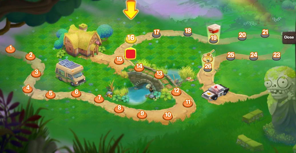 Mildew Meadow was the ninth map stage in Plants vs. Zombies Adventures. It introduced the Imposter Zombie to the player. When the player completed Level 7 of Mildew Meadow, they would have unlocked the Shamrockstar to buy with gems, and the player was given three free Shamrockstars. The player's mission was to get the Honey, after which the "bees" would go away according to Matilda. The honey was needed to reclaim The Bamboo Lot. This was the stage that started the trend that all later stages used, where the players did not meet any normal Zombies.
