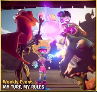 My Turf, My Rules is a Weekly Event game mode in Plants vs. Zombies: Battle for Neighborville. It is a variant of Turf Takeover where players can only play as Snapdragon and Rose on the plants team or Super Brainz and Electric Slide on the zombies team.