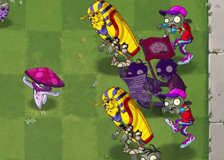 Nightcap has great potential under her awesome appearance. Although she costs a lot of sun, she’ll definitely brighten your eyes and be worth the money. From her attack mode, she’s like Fume-shroom of the same plant family, that is, she can trigger her attack when there is a target within front 4 tiles, but obviously has more advantages: first, she can poison zombies, which is similar to the effect of Shadow-shroom, and second, when the zombie is too close, returning to toxic stealth state, which makes up for the shortcoming of its close attack. Her poisoning ability can ignore armor, which makes her particularly effective against a group of zombies like Buckethead Zombies, but not very useful against units like Gargantuars and mechanical zombies. Try to plant some defensive/slowdown plants/stun plants forward, such as Buttercup and Iceweed, which can prevent her from returning to invisible state, and also make its poison to kill zombies faster. At level one, the damage per second she causes is actually higher than that of Melon-pult with the similar amount of sun cost, and they are both group-effective plants. Because it can be seen as an upgraded-version of Fume-shroom, some strategies of Fume-shroom can be applied to Nightcap. For example, Nightcap is effective against zombies that attempt to shield themselves from normal projectiles, such as Barrel Roller Zombie, Shield Zombie and Excavator Zombie, hitting through their protection and killing them easily. It is worth to note that its poison does not work in grid items such as tombstones.