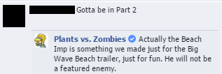 - Despite him appearing in the game, Plants vs. Zombies' Twitter status stated that Greaser Imp was only appear in Big Wave Beach Trailers only, just a sake for fun.