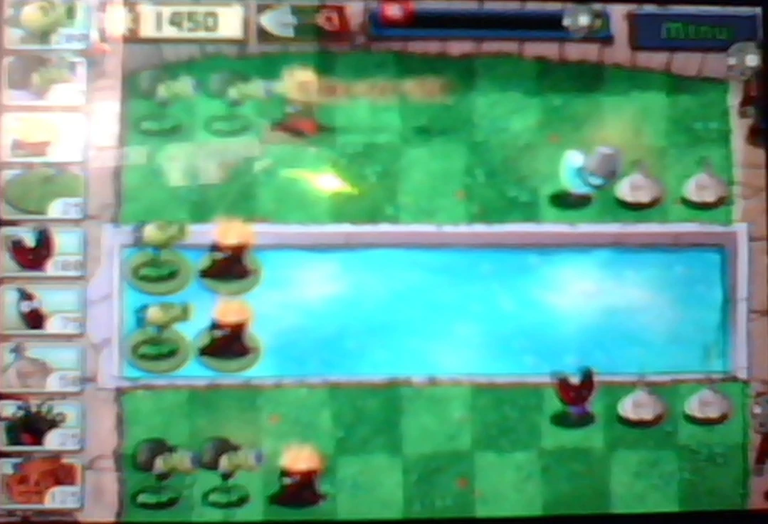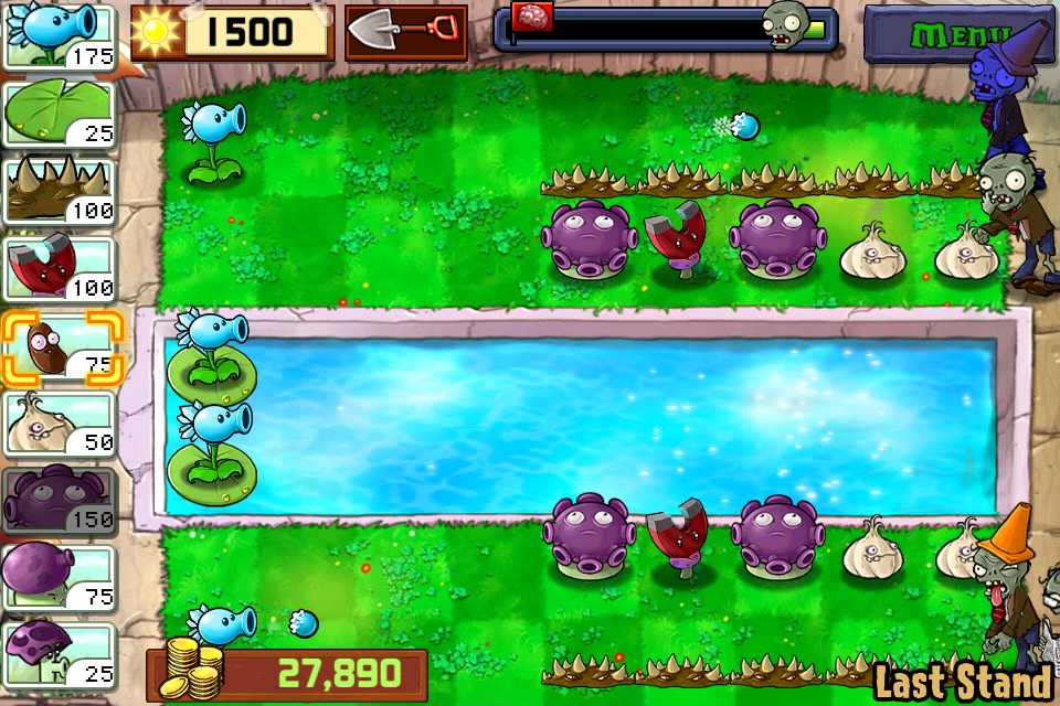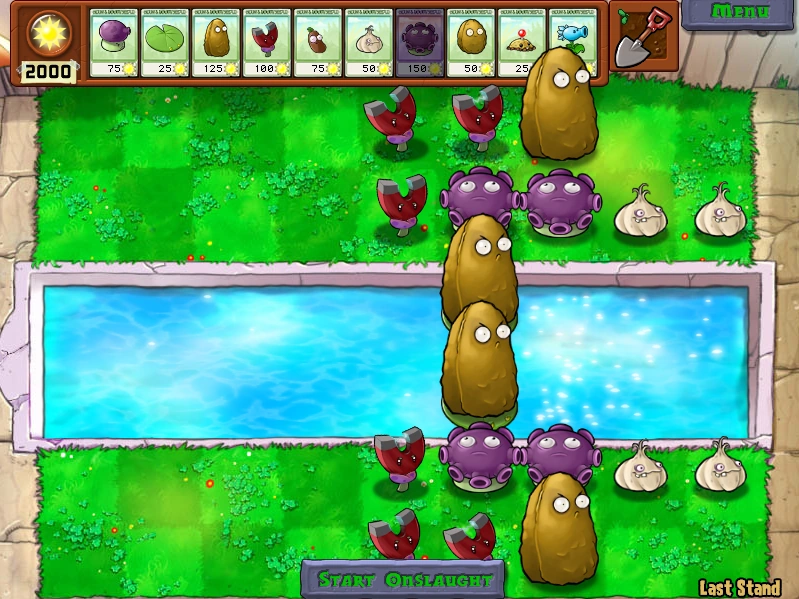 Four Snow Peas to slow down the zombies as they walk the two Gloom-shrooms or five Spikeweeds gauntlet or advance in the pool, maximizing zombie damage and carnage. Two consecutive Garlics are needed in the two lanes next to the pool to steer zombies down the outside paths, serve as backup, and repulse Pole Vaulting Zombies into the correct row. Two Magnet-shrooms are all that are needed. It may look sparse and relatively unprotected, but as long as you replace the eaten Garlics quickly, you do not need to worry about the largest waves.