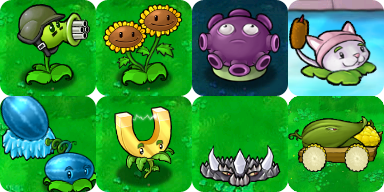 | Normal | Peashooter ยท Sunflower ยท Cherry Bomb ยท Wall-nut ยท Potato Mine ยท Chomper ยท Repeater ยท Puff-shroom ยท Scaredy-shroom ยท Snow Pea ยท Sun-shroom ยท Fume-shroom ยท Grave Buster ยท Lily Pad ยท Squash ยท Spikeweed ยท Tangle Kelp ยท Torchwood ยท Sea-shroom ยท Jalapeno ยท Coffee Bean ยท Tall-nut ยท Pumpkin ยท Magnet-shroom ยท Blover ยท Melon-pult ยท Cactus |